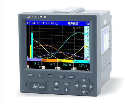 SWP-TSR智能化 TFT 真彩色无纸记录仪在设计上吸纳了当今电脑的结构思路:硬件上采用5.6英寸真彩、高亮度 TFT LCD 作为显示屏,内带快闪存储器的新型微处理器,扩充了大容量的数据存储区,采用了大屏幕液晶图形显示板作为显示器;软件上引入中文 WINDOWS 的框架思路,采用了数据压缩技术。准电脑化的结构,高度地体现了微处理器化仪表的优越性,成功地在体积为144× 144 × 240 mm 的壳体中集成了能实现多回路参数监测,同屏 / 分屏显示多组数字与图文曲线,内含大容量数据记录存储空间的多功能彩色无纸记录仪表。